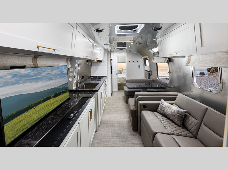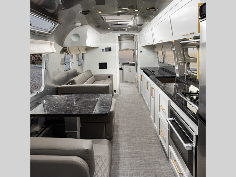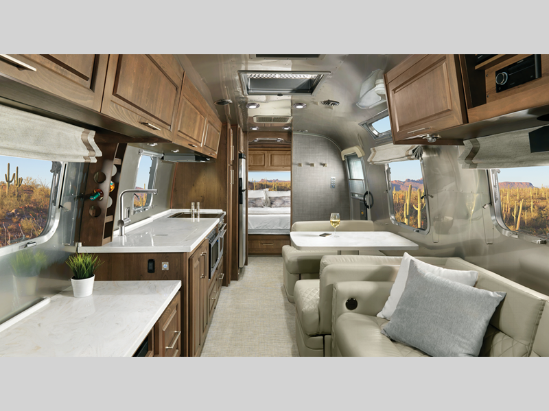 Each model is constructed with a semi-Monocoque aluminum superstructure, an enclosed aluminum insulated and heated underbelly, plus many more durable construction materials so you can enjoy your Classic travel trailer for years to come. You will love the handcrafted interior cabinetry, the panoramic front windows with blackout shades, and the seamless luxury woven vinyl flooring, plus these models feature the most storage of any Airstream so you don't have to sacrifice what you bring along. The residential-style kitchen is packed with luxury and convenience with its Kohler faucet, Corian countertops, and a large stainless steel sink!